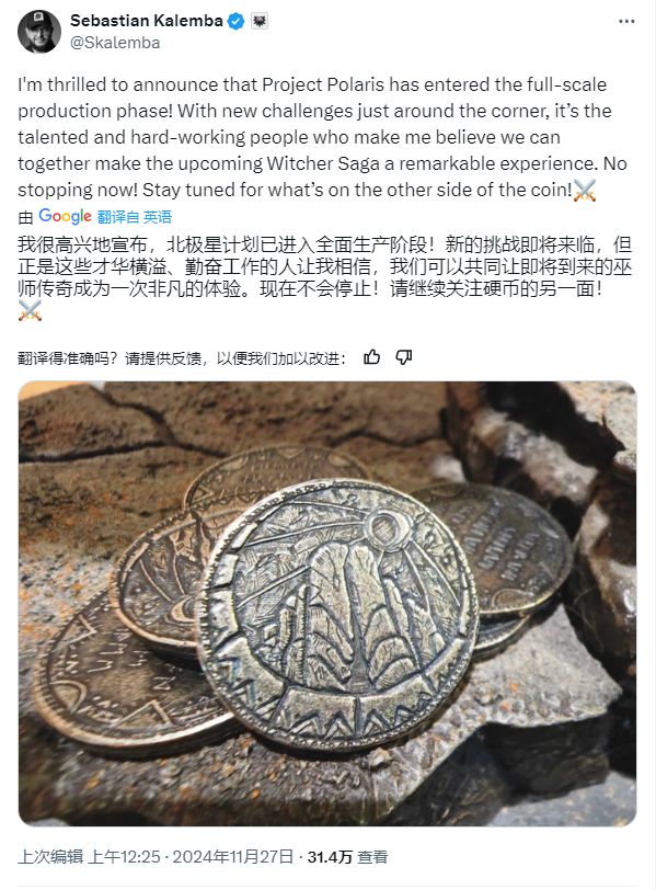 CDPR官方在公布了Q3季度财报之后,其开发者在X宣布,“Project Polaris(代号:北极星)”已进入全面研发阶段,截止到10月31日,有400名开发人员正在参与该项目。根据此前杰洛特配音演员透露的消息,本作中杰洛特会出场,但不会担纲主角。