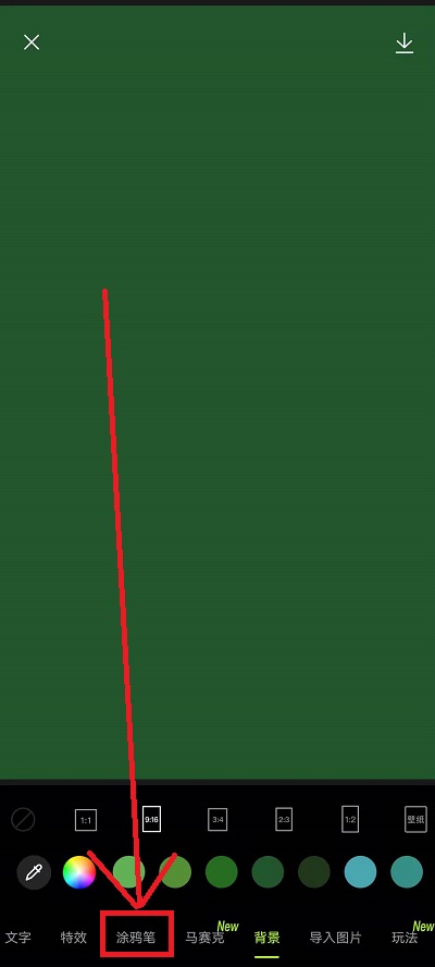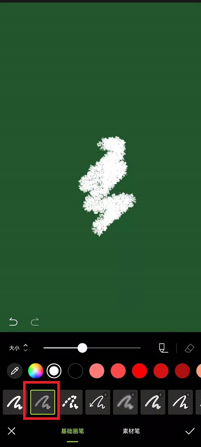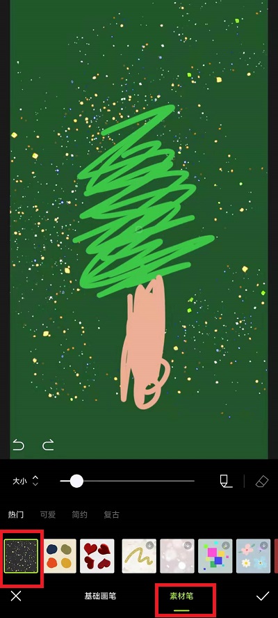 5、在涂鸦笔中,我们选择第二个画笔,更加合适圣诞树,剩下的就是用户自己选择合适的颜色去画出来圣诞树的形状,如果想要更加精致一点,可以点击下方的【素材笔】;