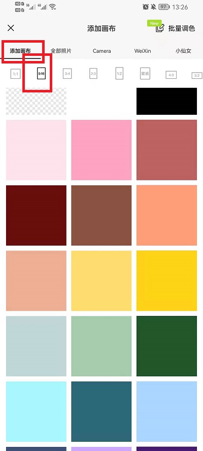3、在导入界面中,我们点击添加图片左边的【添加画布】,在添加画布下方选择【9:16】的画布尺寸,可以在下方选择一个颜色的底图进入到绘画界面;