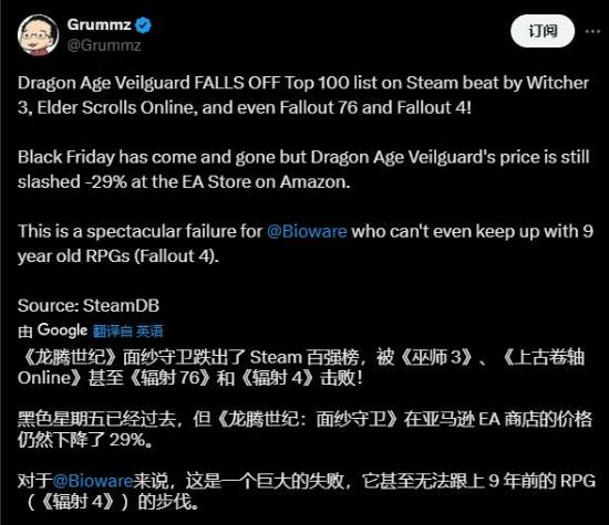 近日,知名游戏博主Grummz在其社交媒体账号上透露,《龙腾世纪4:影障守护者》这款游戏已经从Steam在线玩家榜的前一百名中跌落。甚至在热门游戏排行榜上,它还不如《巫师3:狂猎》、《上古卷轴Online》以及《辐射76》和《辐射4》这些比较陈旧的作品。