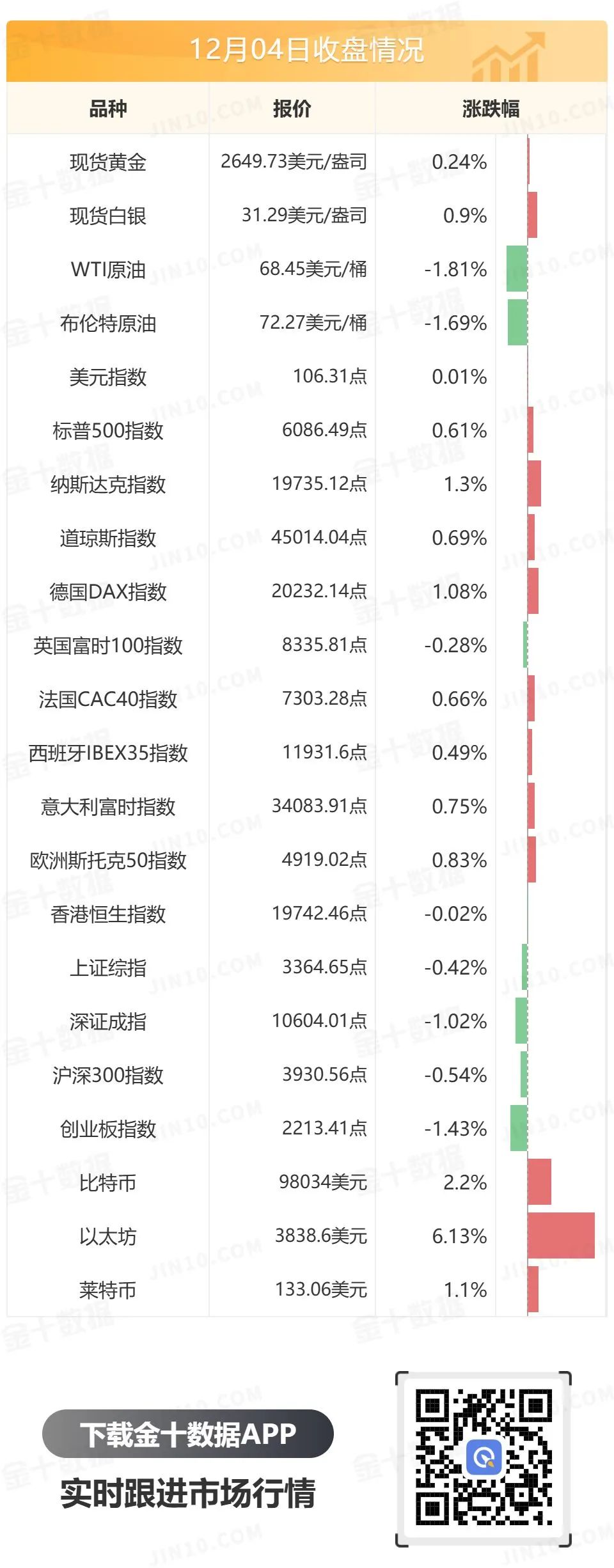 美股道指收涨0.69%,标普500指数涨0.61%,纳指涨1.3%,三大股指均创下收盘历史新高。加密货币概念股领涨大市,MicroStrategy(MSTR.O)涨8.7%,Coinbase(COIN.O)涨近7%。英特尔(INTC.O)跌2%,英伟达(NVDA.O)涨3.5%。纳斯达克中国金龙指数收跌1.38%,京东(JD.O)跌超3%,阿里巴巴(BABA.N)跌近1%。