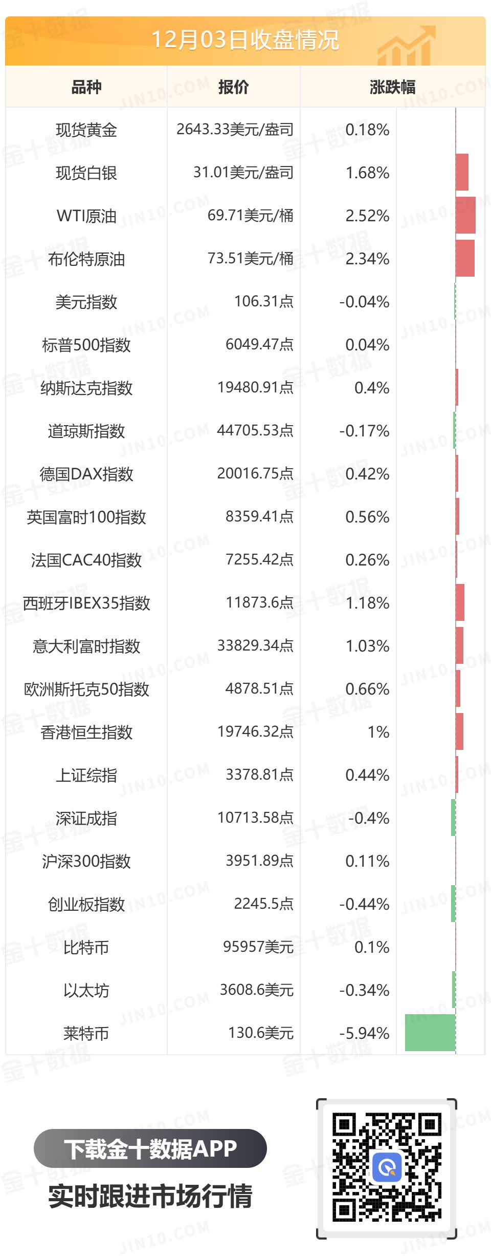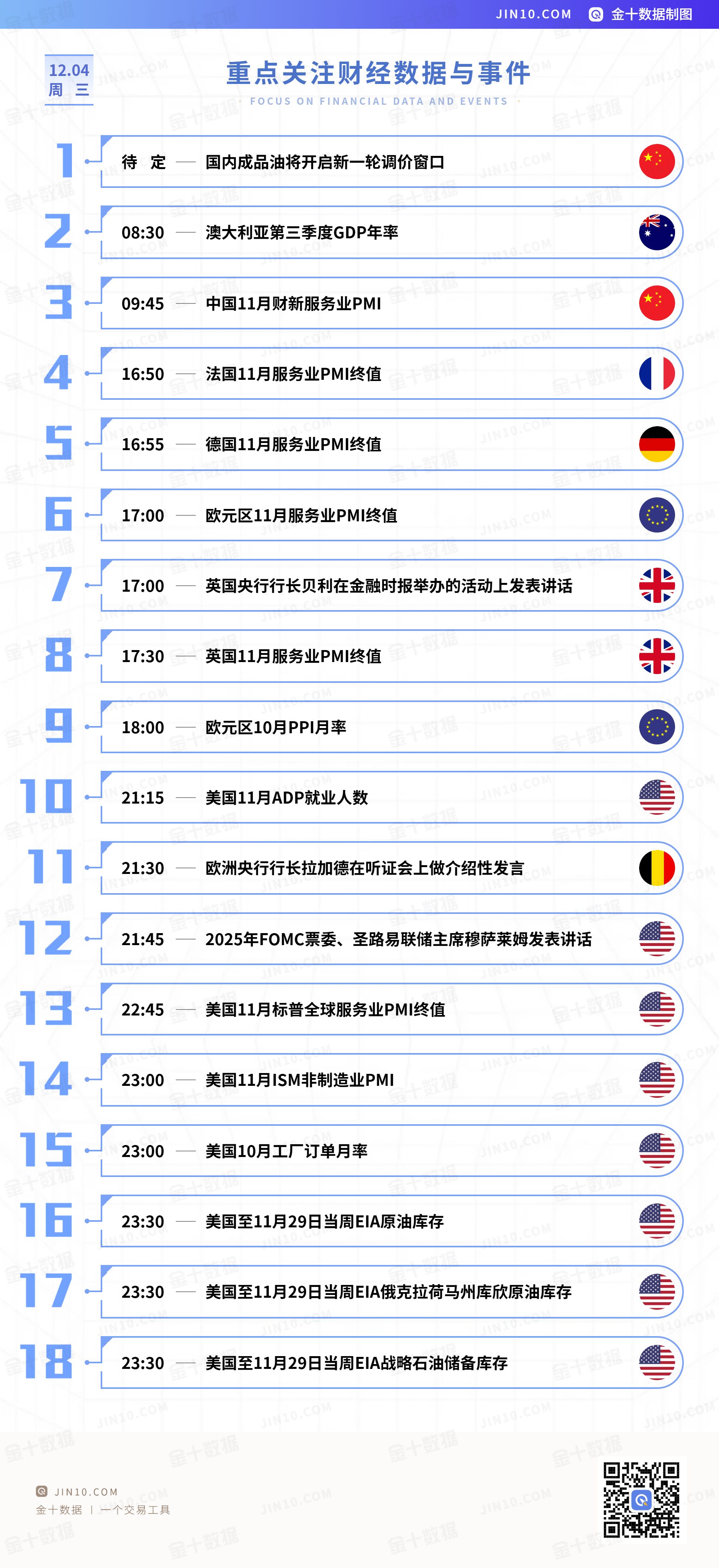 2、美联储理事库格勒:预计周五公布的就业报告将从上个月受风暴和罢工影响的疲软数据中反弹;旧金山联储主席戴利:美联储在12月降息并非不可能,亦不是板上钉钉,需要对降时机持开放态度。中性利率接近3%;芝加哥联储主席古尔斯比:在未来一年中,利率应从目前水平大幅下降。