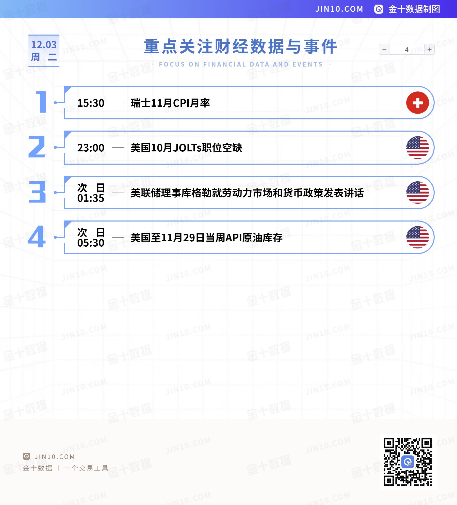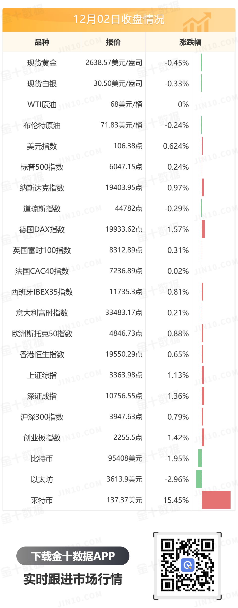 2、美国11月ISM制造业PMI录得48.4,为2024年6月以来新高。美国10月营建支出月率录得0.4%,为2024年4月以来最大增幅。