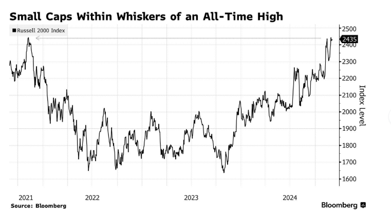 但尽管存在所有这些风险,美股投资者似乎很大程度上没有受到影响,标普500指数上周刚刚创下新纪录。交易员们也纷纷涌入市场风险最高的领域,小型股罗素2000指数在过去两周的涨幅几乎是标普500指数的两倍,并接近自2021年以来的首个纪录。与此同时,芝加哥期权交易所波动率指数处于历史上最平静的水平。