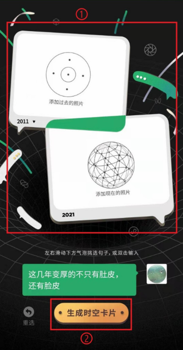 4、我们需要选择一张十年前的照片和十年后现在的照片,然后点击【生成时空卡片】;