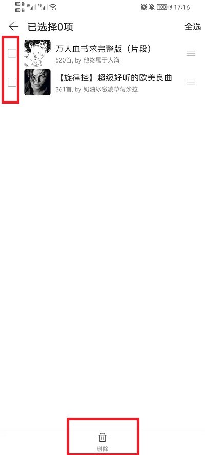 5、在管理界面中,选中所有想要删除的歌单,点击下方的歌单即可。