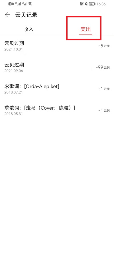 4、在账单界面中,我们点击【支出】就可以看到云贝账单。