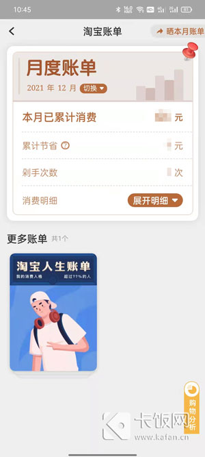 5、进入之后通过【月度账单】查看本月本月消费,还能切换月份查看,点击【淘宝人生账单】看到所有的消费记录。