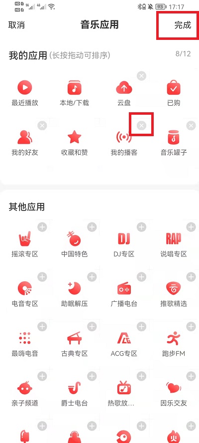 3、在音乐应用界面中,我们点击想要删除的应用的右上角的【x】就可以删除应用,点击完成就可以完成操作。