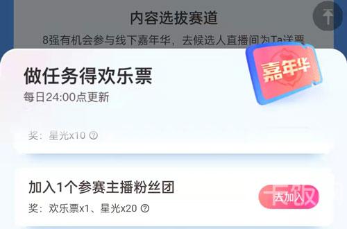 在每天24点之前,加入任意一个参赛主播粉丝团,可以获得1个欢乐票,以及20个星光。