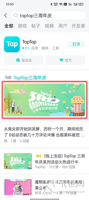 2、点击搜索结果中的专题进入查询注册时间,这是因为taptap没有推出注册时间查询方法,只能通过活动总结来查询;