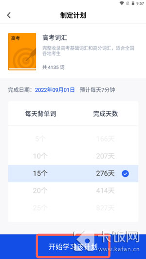 6、然后在制定计划页面,选择每天背单词数量、完成天数,点击【开始学习该计划】;