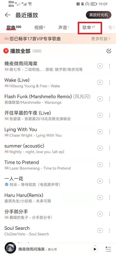 3、最近播放界面中,点击上方的【歌单】进入歌单界面中;