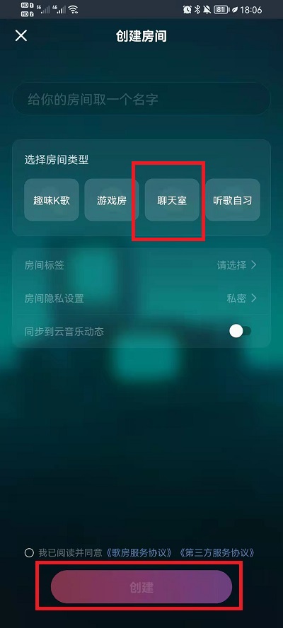 3、然后在创建房间的界面中,我们可以选择房间的类型为聊天室,然后完成其他的内容调谐,就可以完成群聊的创建了。