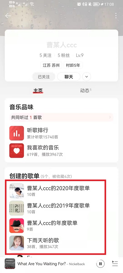 4、在主页中,就可以看到对方的歌单,点击歌单进入就可以听其中的音乐了。