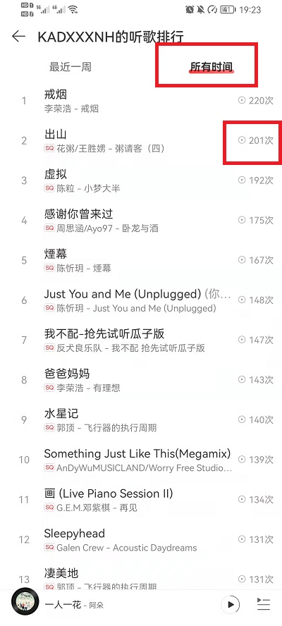 4、在排行界面中,我们就可以看到所有时间我们听过的歌曲次数排行榜。