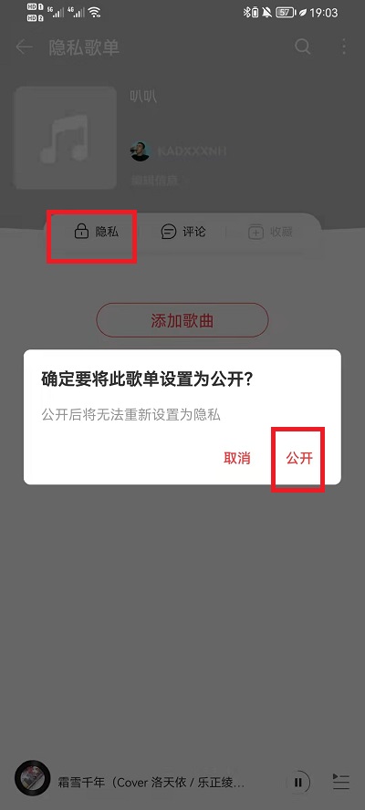 3、在隐私歌单中,我们只需要点击上方的【隐私】然后就会询问我们是否公开歌单,点击【公开】即可。