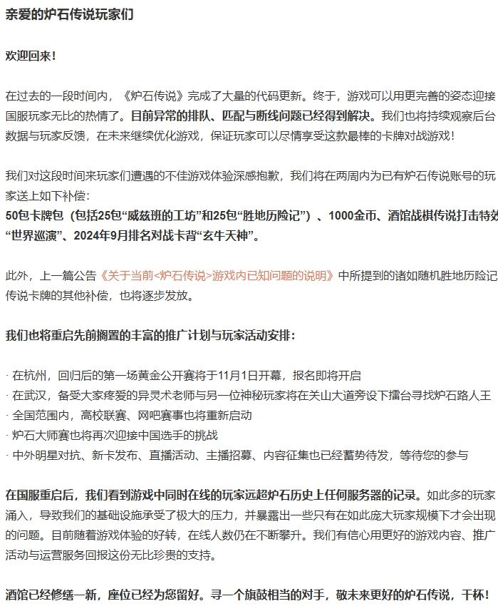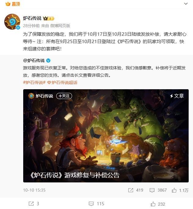 10月10日的时候,炉石官博发文称,游戏服务已经恢复正常,并向玩家致歉,造成了不好的游戏体验。随即发布了《炉石传说》游戏修复以及补偿完整公告。