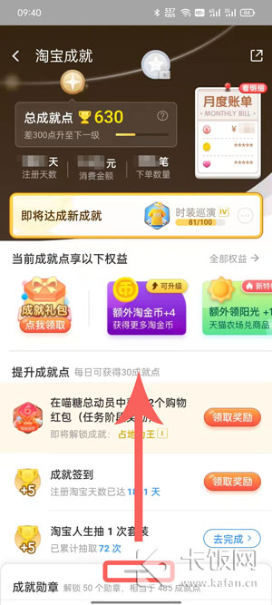 4、在最上方可查看当前的淘宝成就点、注册天数、消费金额等,按住下方的【成就勋章】上滑打开查看;