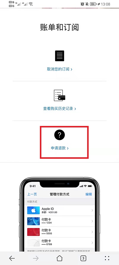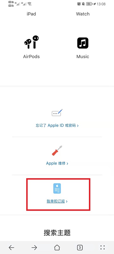 4、在技术支持页面,上划页面,在下方可以看到【账单和订阅】,点击进入到其中;