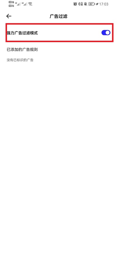 3、进入到设置界面中之后,我们需要点击【广告过滤】进入到广告过滤界面中,然后在界面中,会有一个【强力广告过滤模式】我们点击右边的按钮打开此功能即可。