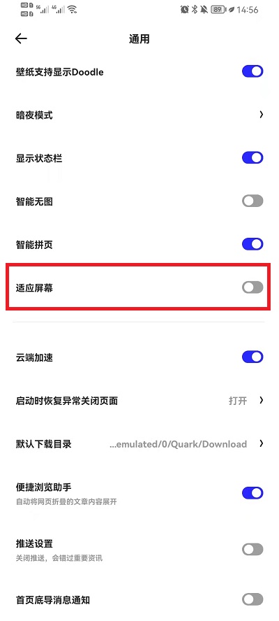 4、在通用中,我们需要上划功能,在下方找到【适应屏幕】我们打开此功能的按钮,即可设置为全屏。