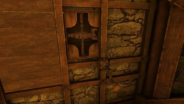 2、点击得到箱子旁的曲柄摇杆,将曲柄木杆插入插孔,摇动木杆,放入木头齿轮,再次摇动木杆,打开机关。