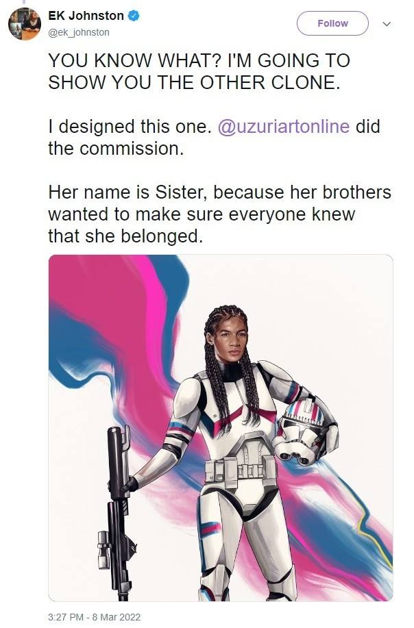在《星球大战》中,克隆人的外貌和生理性别理论上应与母体相同,但前传小说并未解释Sister是如何成为变性人的,或者这仅仅是一种社会身份的选择。艺术家Uzuri Art为Sister创作了非官方的角色肖像画,画中的克隆人士兵留着长辫子,身着一套带有LGBT骄傲色彩的战斗盔甲。