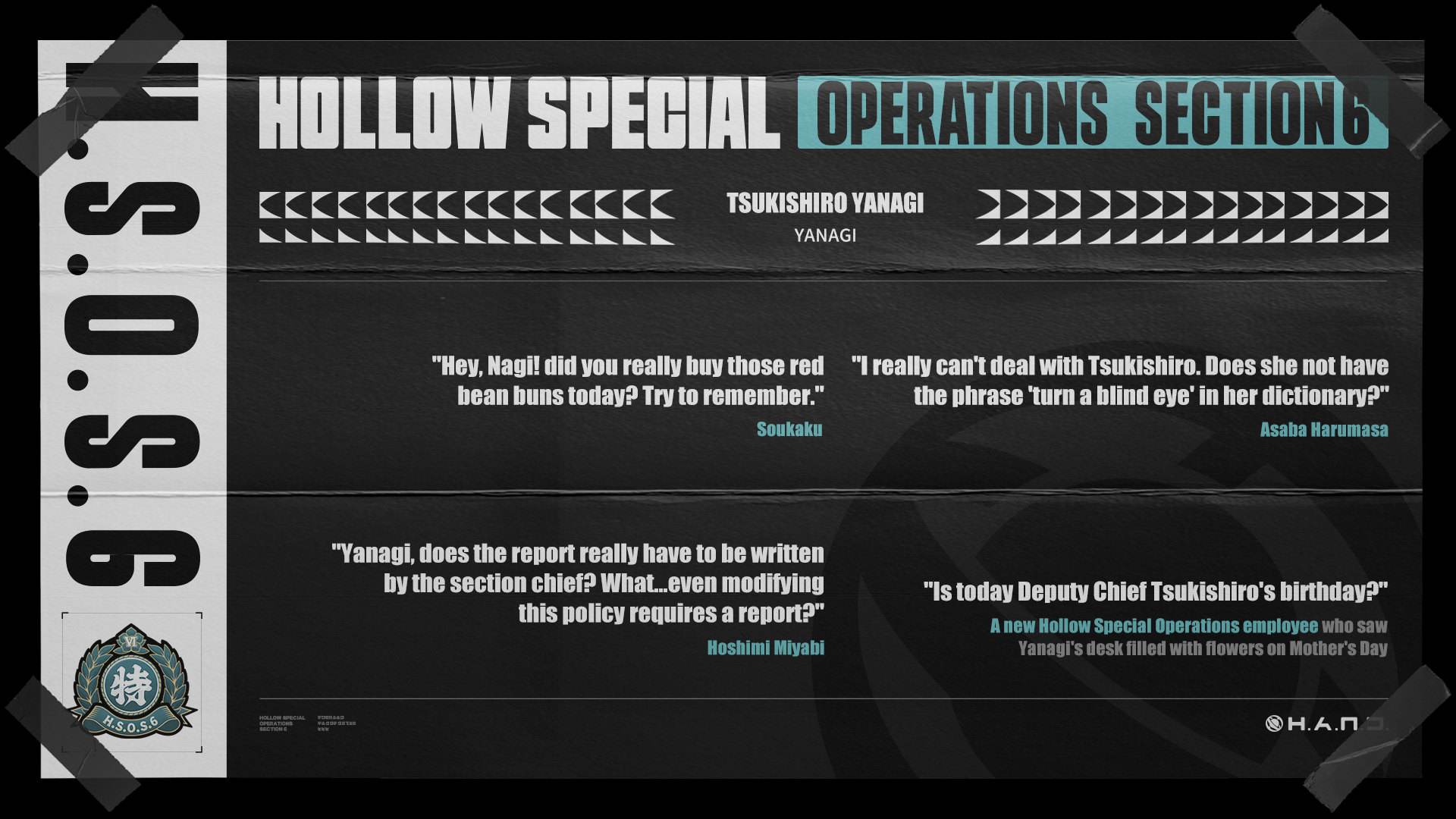 月城柳是Anti-Hollow Division 6的一名特工成员,这里配备着最先进的设备和一流的成员,是一支防空洞灾害专家团队,专处理高风险病例。而月城柳则担任团队中的副科长,科长是星见雅。
