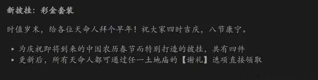 “彩金套装” 是为庆祝即将到来的中国农历春节而特别制作的披挂,一共四件。更新后,所有玩家均可通过任一土地庙的【谢礼】选项直接领取。