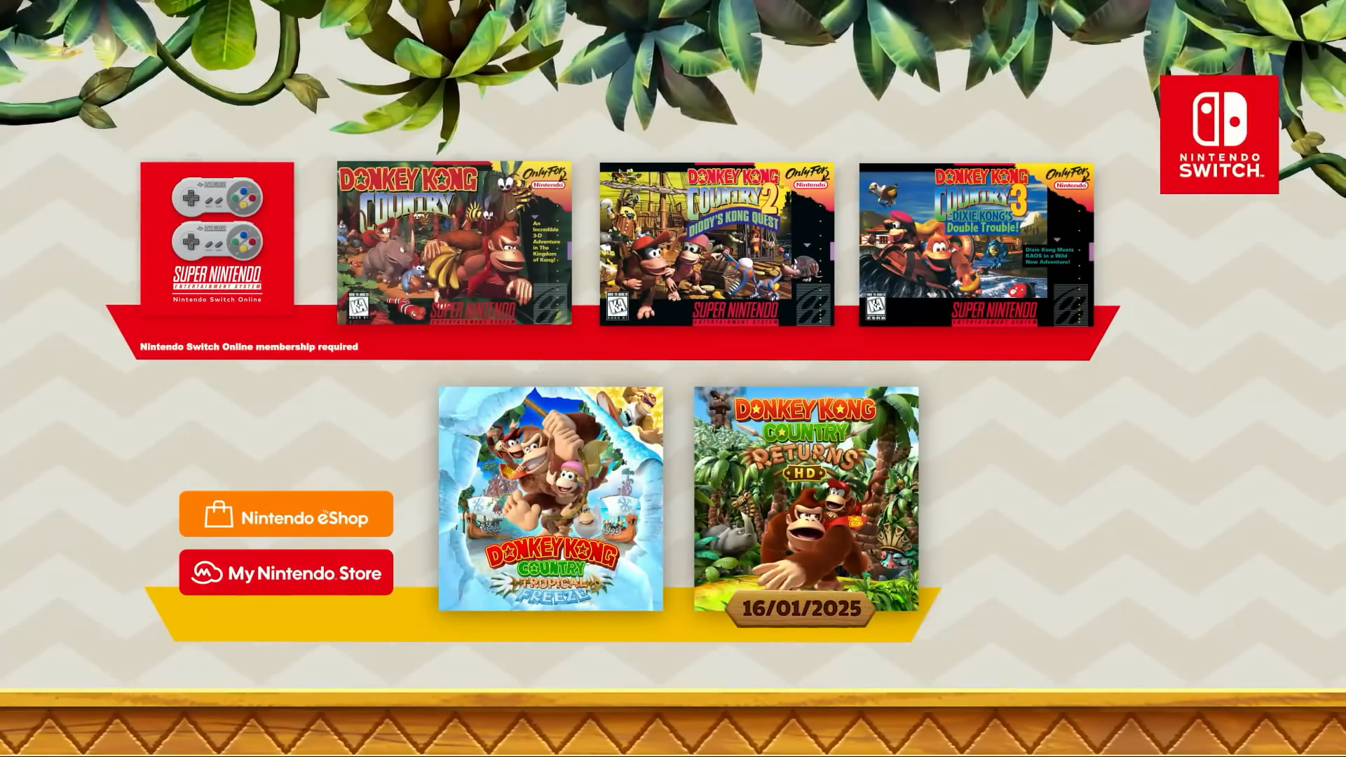 《大金刚国度:归来HD》将于2025年1月16日登陆任天堂Switch,预告片中的其他游戏现已全部发售。