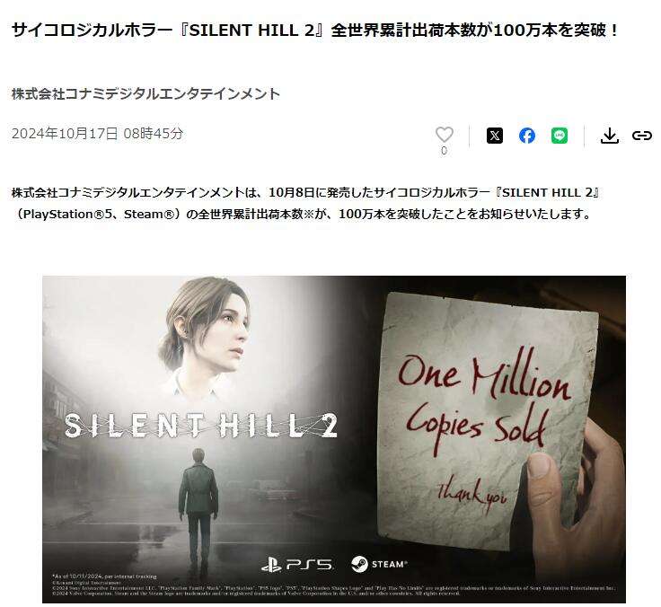 科乐美公司今日宣布,《寂静岭2:重制版》的数字版游戏销量和出货量在全球范围内已超过100万份!