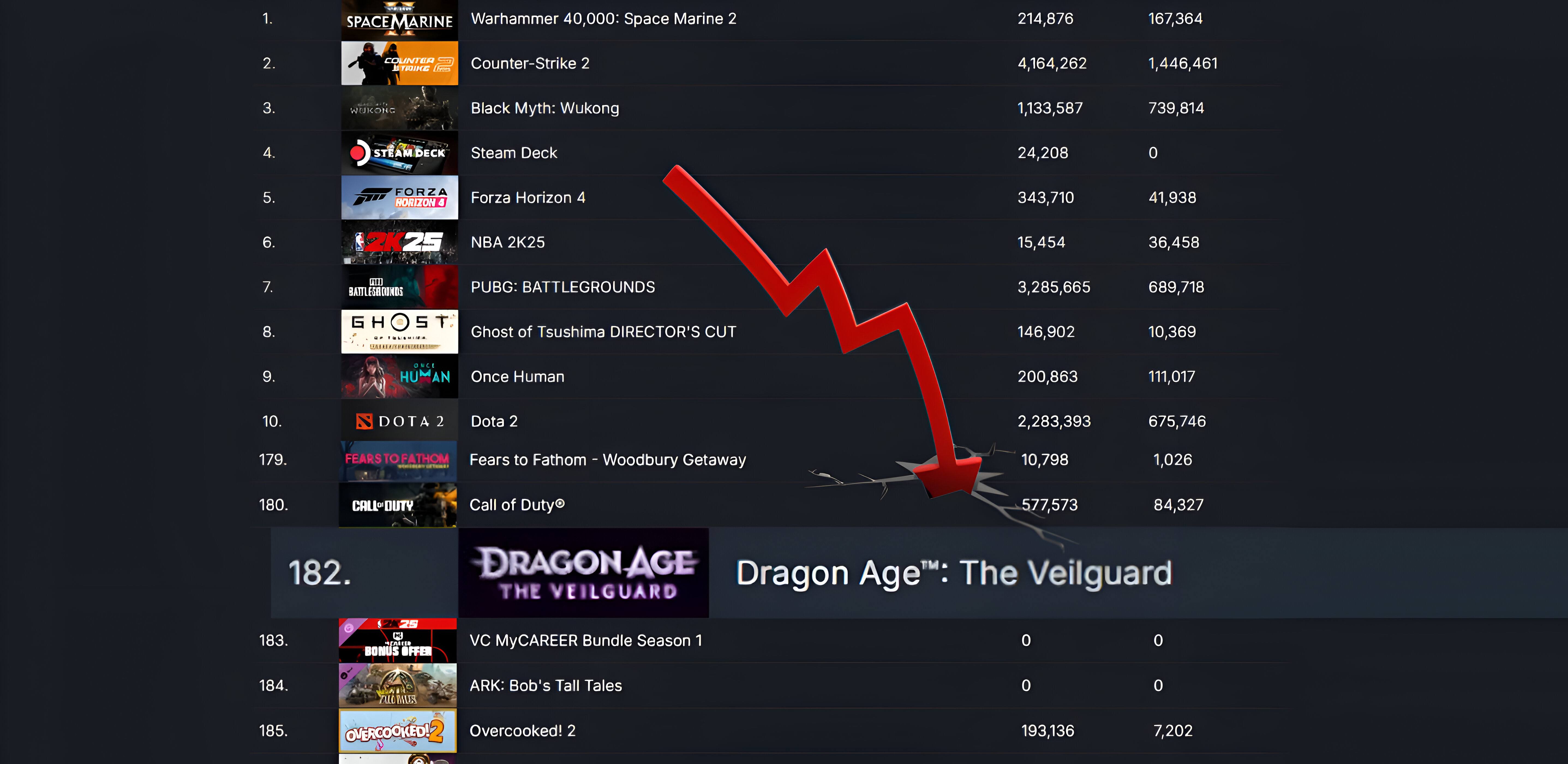 《龙腾世纪:影障守护者》不仅未能跻身Steam销量百强,更在激烈的竞争中位列第182位,其Steam愿望单排名也仅居第42,这些数据无疑透露出玩家对该作的热情有限。