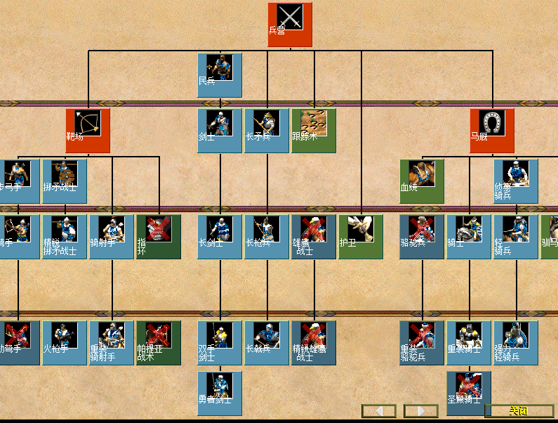 一旦有了兵营,就要不断研究科技,提升步兵的能力,如铁甲( 1步兵护甲)和血统(提升骑兵血量)。每当进入新的时代,就应该在军事建筑的旗帜下研究相应的升级科技。