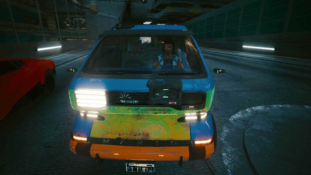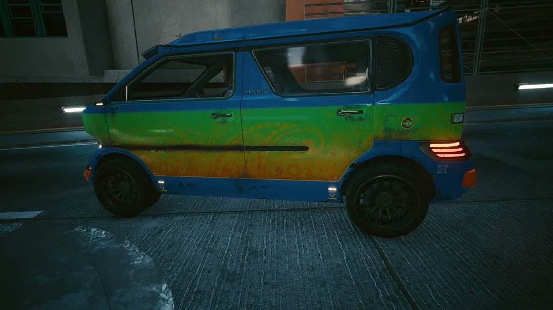 在夜之城周围总会有车来来往往,当你仔细观察时,会发现一辆带有特别涂装的面包车——史酷比车。这是动画史酷比中的一辆神秘面包车,车身带有绿色与橙色小花的涂装。虽然游戏中的涂装与原版不太一样,但是仔细看能看到有一些花纹,有一种致敬的意思。