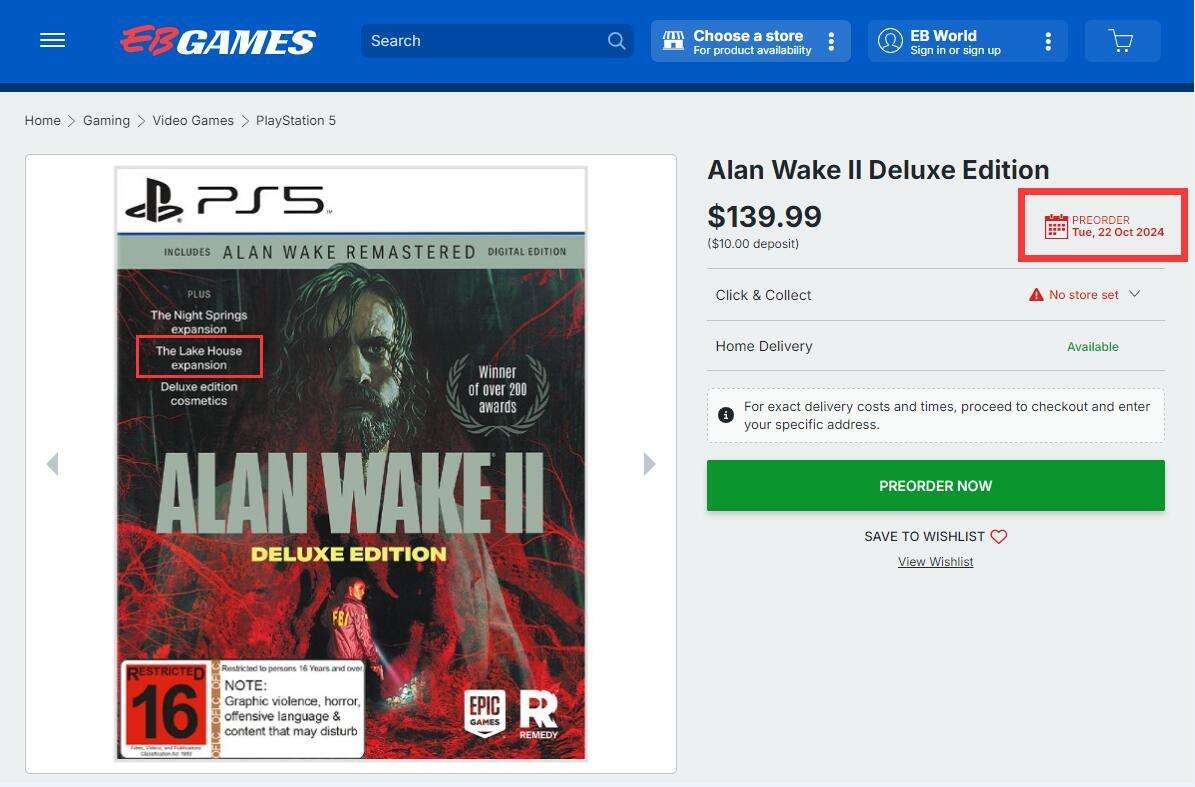 根据EB Games的《心灵杀手2:豪华版》的商品页面显示,“湖边小屋”需要等到10月22日午夜之后才会向实体版光盘用户解锁——但需要注意的是,这是新西兰时间。但无论如何,看起来粉丝们很快就可以玩到这个资料片了。而我们也可以期待在明天的“Xbox合作伙伴Preview”中,Remedy Entertainment或将公布资料片发售时间的消息。