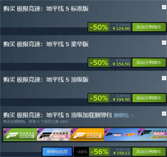《极限竞速:地平线5》和《极限竞速:地平线4》均追平了历史最低价。《地平线5》所有版本限时五折:标准版原价248元,现价仅124元;豪华版由309元降至154元;顶级版从389元直降至194元!赶紧行动,加入赛道,体验顶级竞速的魅力!