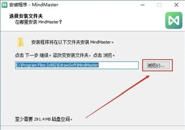 4、点击【浏览】更换安装路径,建议不要把MindMaster软件安装在C盘系统盘,安装在其它磁盘。点击【下一步】