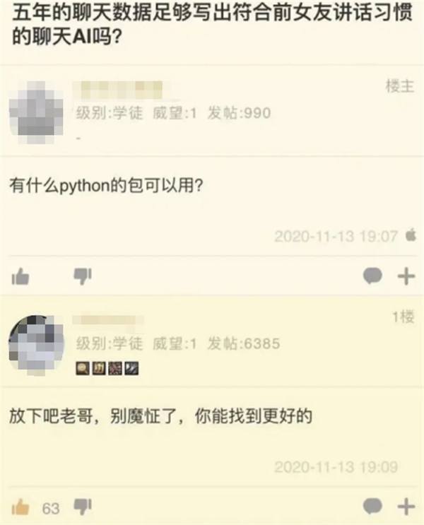 几年前在网上看到过这样的搞笑图。一个程序员老哥在帖子上询问网友,跟女友分手了,感觉很悲伤,能否用前女友的聊天记录来投喂AI,以此实现和前女友聊天的效果。这个问题一出就有不少网友让他清醒一点,多出去走走,要专注当下。
