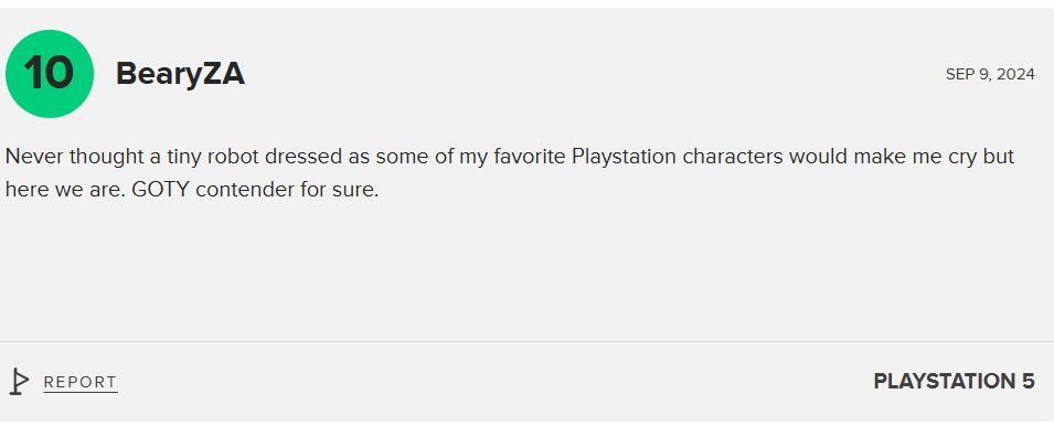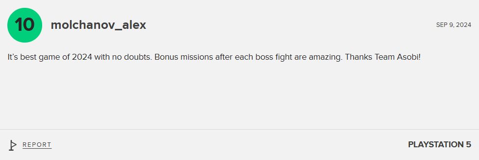 近日,《宇宙机器人(ASTRO BOT)》在M站的用户评分已正式出炉。截稿之前,该作供收录了1553条测评,其中好评1464条,中评44条,差评45条。该作有众多玩家打出满分10分的成绩,均分高达9.5。