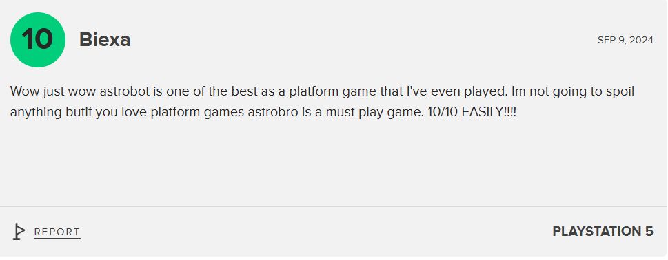 哇哦,太棒了!《宇宙机器人》是我玩过的最好的平台游戏之一。我不会透露任何游戏内容,但如果你喜欢平台游戏,那么《宇宙机器人》绝对是必玩的游戏。满分10分,绝对当之无愧!