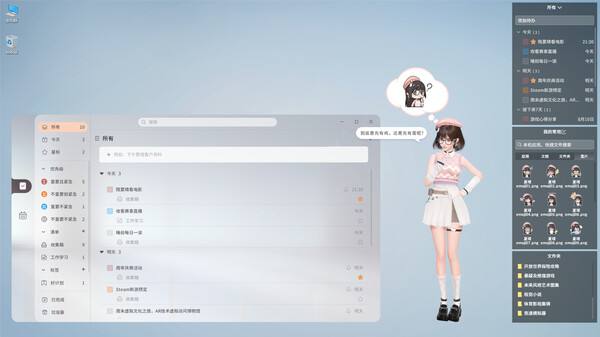 桌面精灵集成了多种实用工具,包括详细的日程待办、桌面整理和文件查找功能。无论是繁忙的工作日还是轻松的周末,她都能帮助你高效管理时间和资源,让一切井然有序。