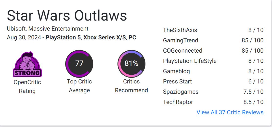 育碧新作《星球大战:亡命之徒》发售在即,游戏的全球媒体评分于昨晚正式解禁,目前本作在MC上PC版均分78(25家媒体给出),PS5版77分(62家媒体给出),Xbox版78分(21家媒体给出)。下面让我们一起来看看吧!