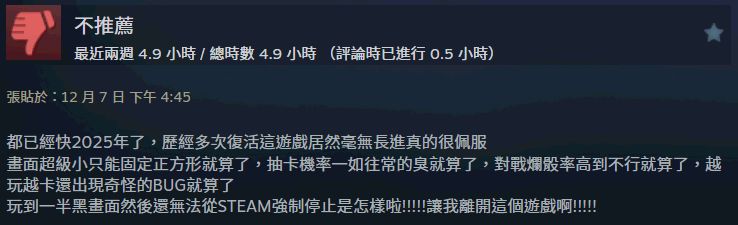 常被诟病的问题普遍在于:服务器不稳定经常导致创建角色卡住或游戏闪退,内存占用高,分辨率太低,以及经常性黑屏与各式 UI Bug 等等状况。虽有养成流程简化与丰富开服奖励等优点,但仍不足以掩盖其他重大缺点。截至稿前游戏已累积 458 则评论,当前 Steam 整体评价「褒贬不一」。