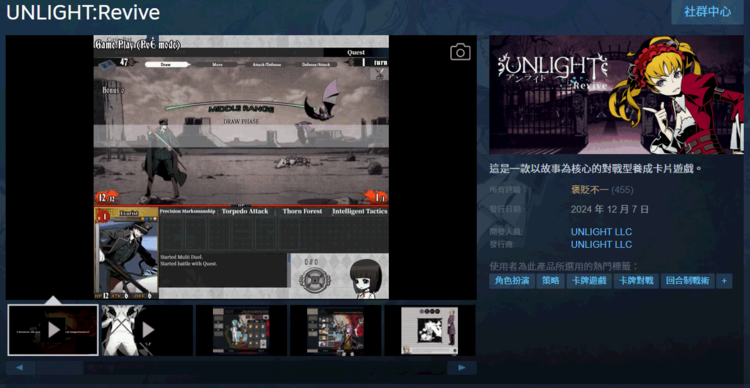 以日本 TechWay 所开发的卡牌网页游戏《Unlight》为基础,重启版本《UNLIGHT:Revive》国际服已于 12 月 7 日 Steam 上架!