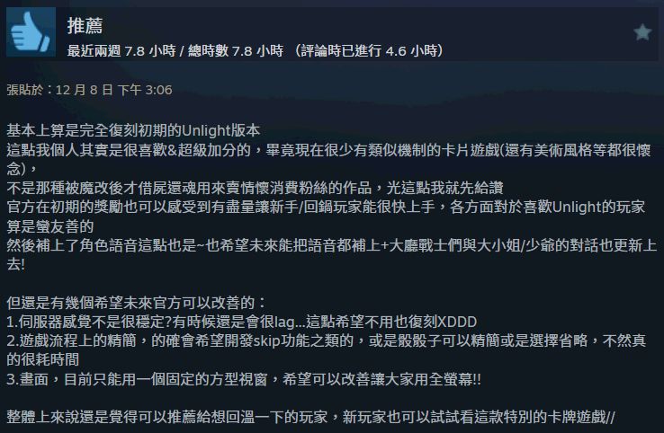 据 Steam 评论区讨论,《UNLIGHT:Revive》无论在美术风格、音乐歌曲还是战斗玩法皆原汁原味还原,对想回忆游戏的玩家是大加分项,然而缺点同样也是「原汁原味还原」。