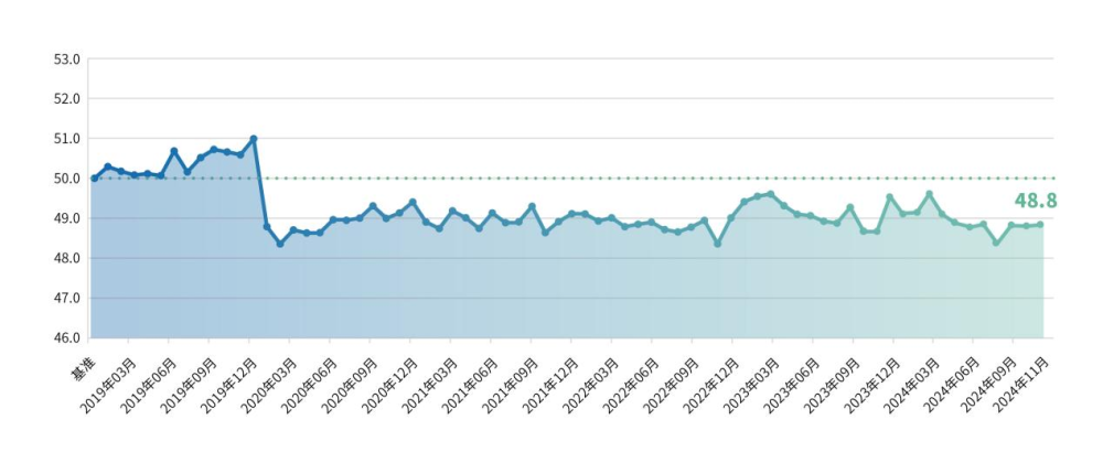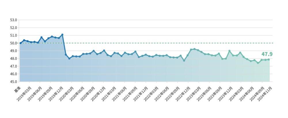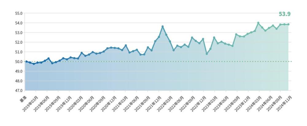 11月,经营景气度指数为47.9点,环比上升0.1点。当前,随着增量政策的密集出台与有效实施,社会预期和市场信心正在逐步回升。小微企业活力经营绩效保持平稳,今年以来始终保持在50点以上,经营投入和活力指数均分别上升0.1点。消费品以旧换新等促消费政策持续带动市场销售增长,服务消费需求持续释放,信息类、文娱类服务零售额较快增长,企业生产经营活动加速活跃。