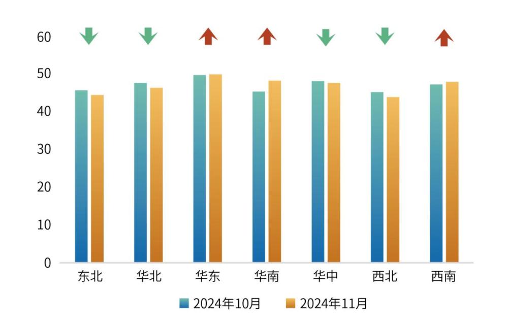 分区域来看,七大区域经营景气度指数呈现3升4降的趋势。其中,华东、华南、西南地区指数有所上升,分别为49.8、48.1、47.8 点;华中、华北、东北、西北地区指数有所下降,分别为47.5、46.2、44.3、43.7点。