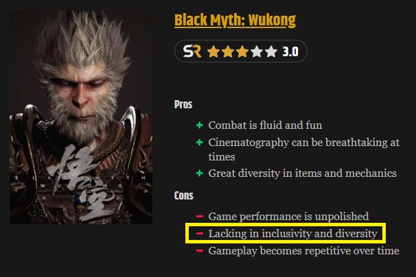《星球大战:亡命之徒》的媒体评分在昨日解禁,游戏媒体Screenrant为它打出了4分,并称赞其战斗和探索让人满意。而面对《黑神话:悟空》,游戏媒体Screenrant只给出了3分,并表示:“缺乏包容性和多样性”。