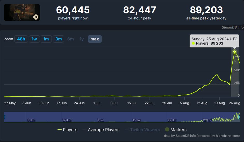 自游戏发布以来,已有上万名玩家在线游玩,且人数还在不断增加。在Valve正式宣布游戏之后,玩家数量激增,最高同时在线人数达到惊人的89,203人。